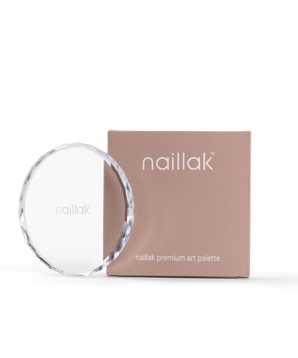 paletten er fremstillet i tungt, klart glas med et diskret naillak-logo. materialet giver både stabilitet og præcision, så den ligger fast på bordet og føles solid i hånden. den glatte overflade er nem at rengøre og bevarer sin klarhed, uanset hvor ofte den bruges.