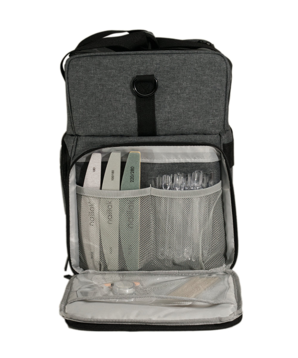 • Plads til UV-Lampe og tilbehør: Øverste del af tasken er designet til at rumme en Naillak UV-lampe samt andre nødvendigheder som neglelakfjerner eller cleanser, med en justerbar rumdeler for at holde lampen stabil og sikker.