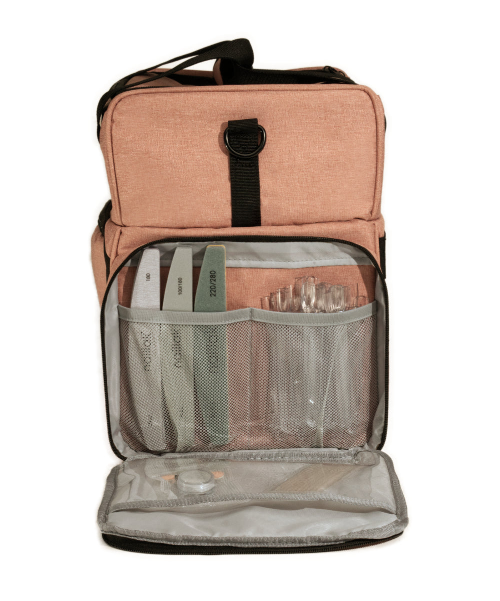 • Plads til UV-Lampe og tilbehør: Øverste del af tasken er designet til at rumme en Naillak UV-lampe samt andre nødvendigheder som neglelakfjerner eller cleanser, med en justerbar rumdeler for at holde lampen stabil og sikker.