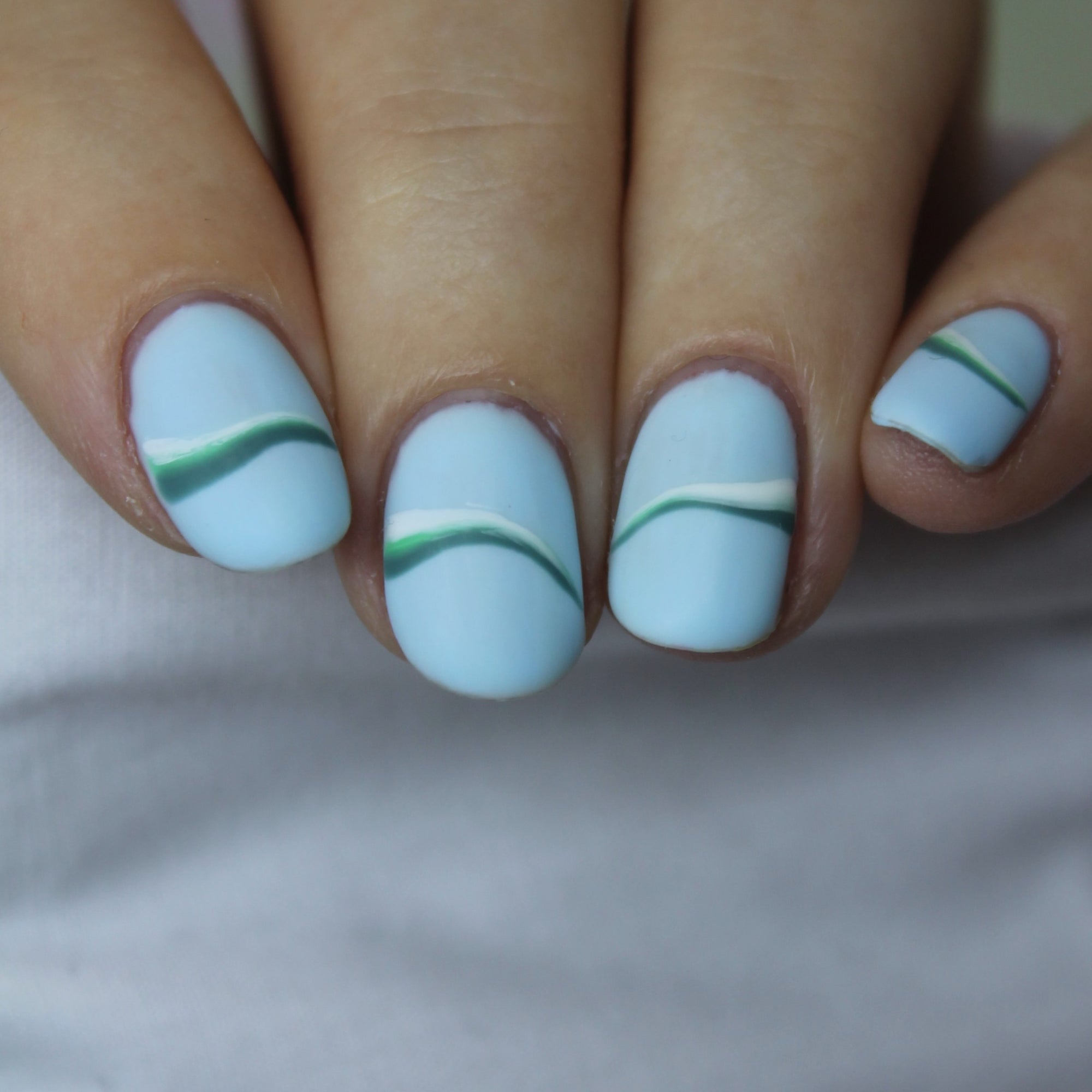 Du lægger to lag af basen, Blue Sky, og hærder den i din UV lampe. Derefter maler du den første streg af bølgen - jeg startede med Snow (den øverste streg) og arbejde mig nedad med farverne. Det er vigtigt at hærde gellakken mellem hver streg - ellers blander farverne sammen, hvilket vi ikke går efter med de her sommernegle.