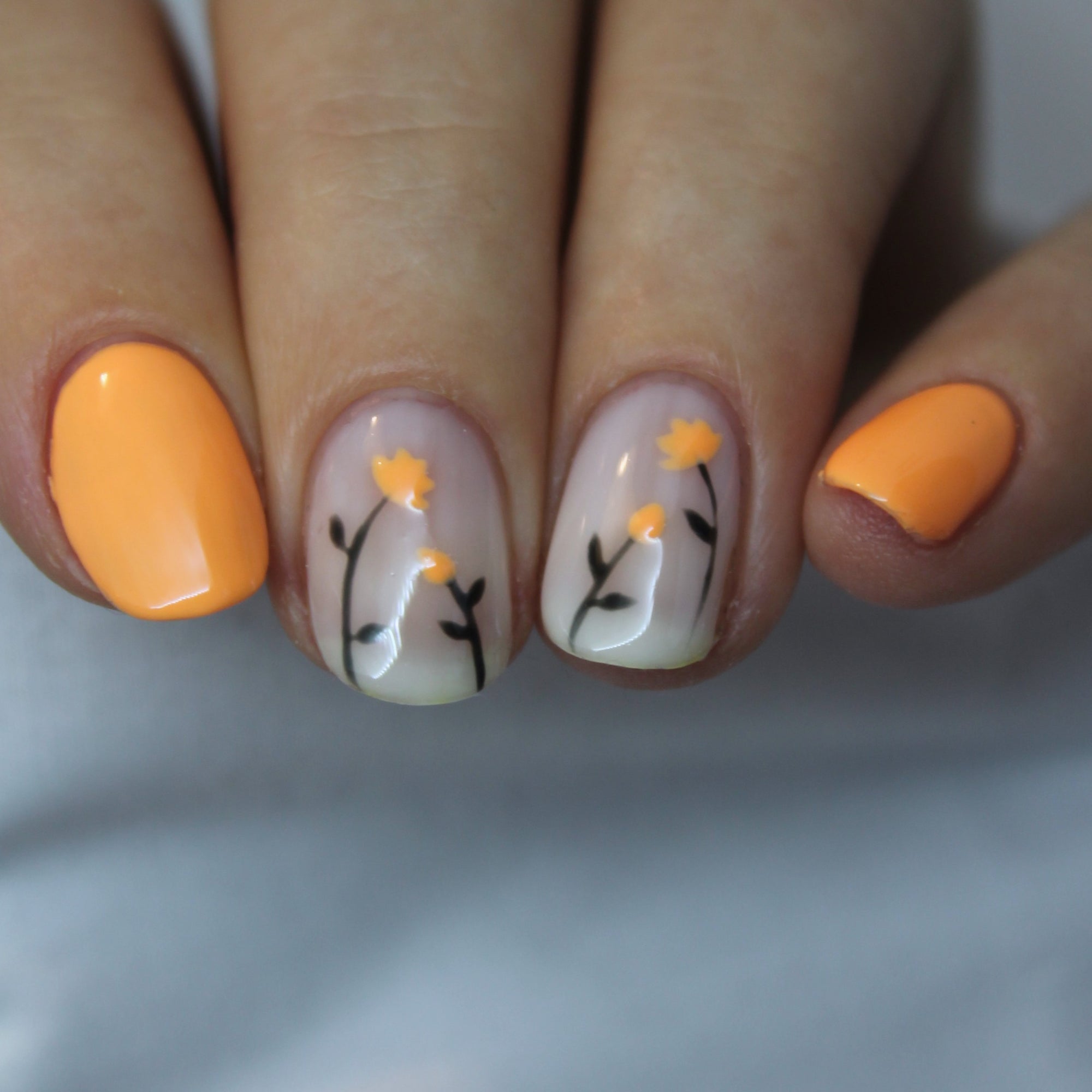 Basen til blomsterne er Milky White, og ellers er det Tangerine og Midnight Black, der er brugt til de her sommer negle. Når du har lagt et par lag af Milky White, maler du først de sorte stilke med en Liner Brush for at se, hvor dine blomster skal være på neglen. Når de er hærdet, kan du male små blomster på med en Detail Brush - enten nogle der er sprunget ud, eller de små fine skud (du kan se begge dele på det her design).