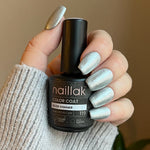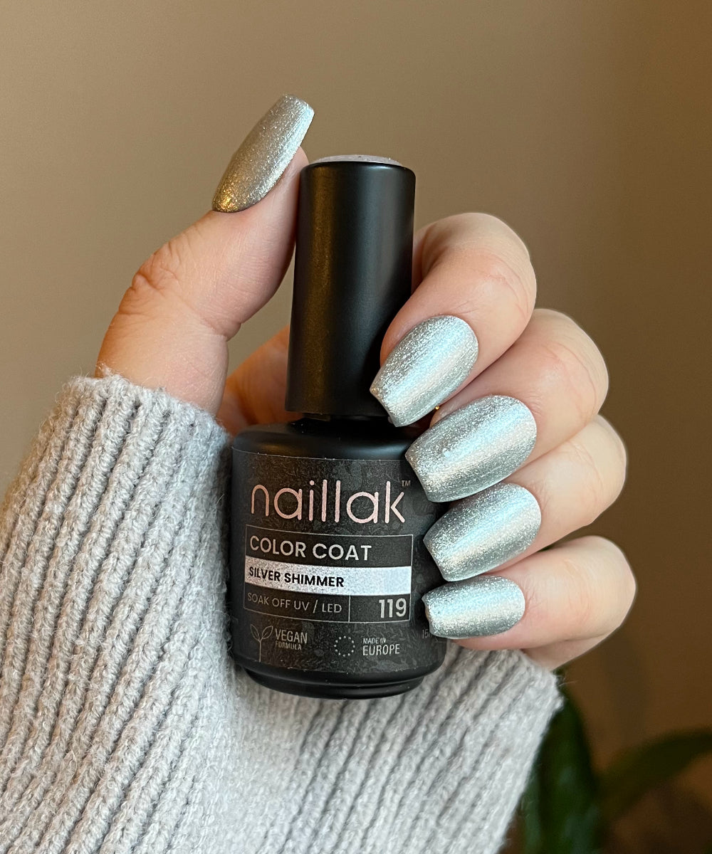 Silver Shimmer er en af vores skinnende metalliske gellakker. Silver Shimmer er en flot sølvmetallisk gellak, der næsten er som at have et spejl på neglene. Gellakken har en tyndere konsistens end almindelige glitterlakker. Det er fordi, glimmeret er så fint, at det minder om flydende metal, du lægger på neglene. Silver Shimmer dækker neglen i to lag, hvilket også er ret imponerende for en metallak. Ligesom med smykker er sølv et køligere metal i farven, men det er stadig et elegant touch til både hverdag og fest. Og heldigvis er det ret trendy at blande metaller, hvis du har sølvringe på, er du bare med på moden med Silver Shimmer.