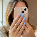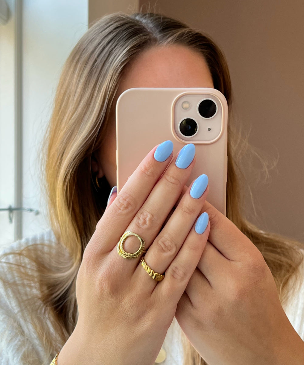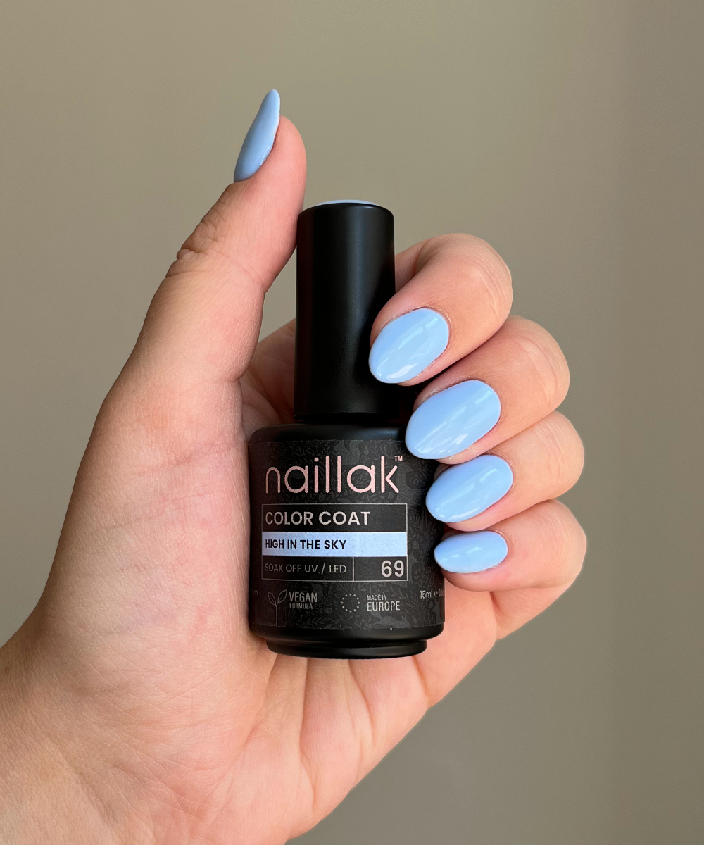 High In The Sky er en smuk blå gellak, der ikke kan gøre dig andet end glad. Det er en af vores flotte blå farver, men denne har lidt varmere undertoner i modsætning til bl.a. Blue Sky og Baby Blue. Udover at føre tankerne hen til den varme sommerhimmel, kan High In The Sky også sammenlignes med de små fine blomsterblade på den elegante sommerblomst forglemmigej. Selvom du måske vil sige, at High In The Sky er en gellak, der læner sig over mod sommerfarverne, kan du også sagtens bruge den i de koldere måneder - de varme undertoner gør farven mildere, så den virker ikke så voldsom mod hudens vintertoner.